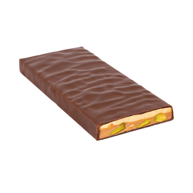 Extradunkle Milchschokolade 60% gefüllt mit weißem Nougat, Pistazien und Haselnüssen