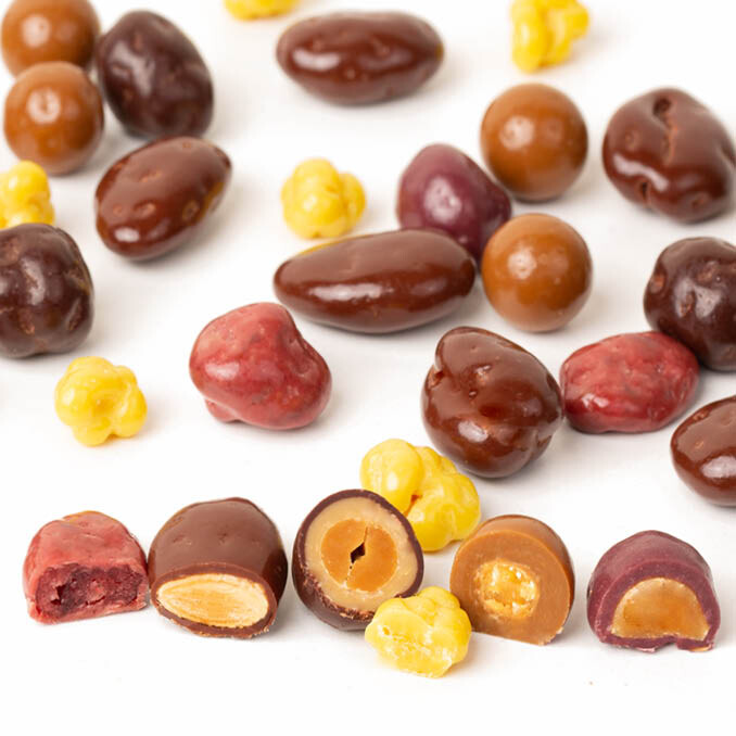 Ein bunter Knabberspaß mit Nüssen und Früchten: Karamellisierte Mandeln umhüllt von Milchschokolade, feinstes Mandelkrokant in einer bonbonsüßen Karamellhülle, knusprige Maracuja umhüllt von sonnengelber Maracuja- kuvertüre, knackige, gesalzene Erdnüsse überzogen mit Karamellkuvertüre und dunkler Edelschokolade, getrocknete Cranberries in roter Preiselbeerkuvertüre und buttrig-süße Macadamien in lila Johannisbeerkuvertüre.
