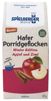 Ausgesuchte Mischung aus verschiedenen Haferflocken für sämig-kerniges Porridge in der Winter Edition mit getrockneten Apfelstücken und Zimt.