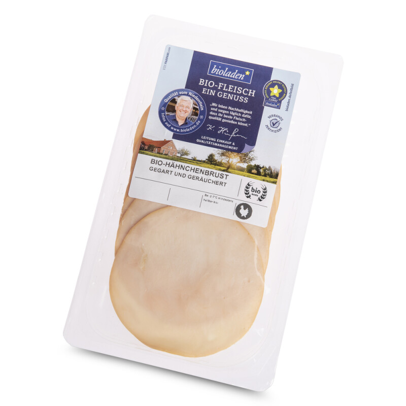 Die gekochte Hähnchenbrust ist ein handwerklich hergestellter Garschinken aus der Brust mit einem hervorragendem Geflügelaroma und einem feinen Rauchgeschmack, in Scheiben geschnitten. Das Fleisch für dieses bioladen*Produkt stammt von verbandszertifizierten Höfen. Dort wachsen die Tiere ihren Bedürfnissen entsprechend auf.