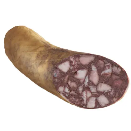 Schweinefleisch*, Schweineblut*, Schweineschwarten*, Kesselbrühe*, Zwiebel*, Meersalz, Pökelsalz, Pfeffer*, Piment*, Majoran*, Kümmel*, Nelke*, Knoblauch*, Koriander*, Wacholder*, Rosmarin*, Lorbeer*, Schweinedarm*, Buchenholzrauch