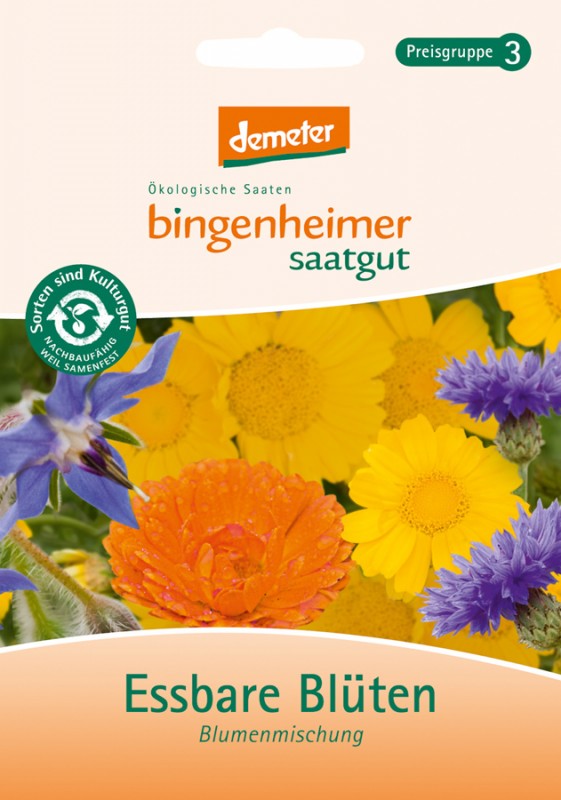 Mischung aus Ringelblume, Borretsch, Speisechrysantheme und Kornblume. Dekorieren Sie mit den Blüten geschmackvoll Ihre Speisen. Ernten Sie regelmäßig: so fördern Sie die Bildung weiterer Blüten. Säen Sie breitwürfig auf 2 - 3 m² ca. 1 cm tief.