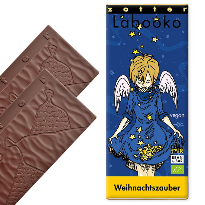 Edel & Dunkel. 2 unterschiedliche Tafeln in einer Verpackung: Einmal eine dunkle Ursprungsschokolade mit legendärem MayaKakao, der aus Belize emissionsfrei mit dem Segelschiff transportiert wurde. Und einmal eine dunkle Ursprungsschokolade mit handselektiertem Kakao von »Mountains of the Moon« in Uganda..